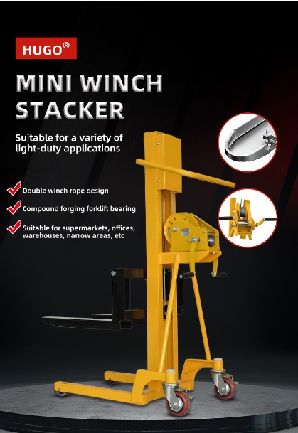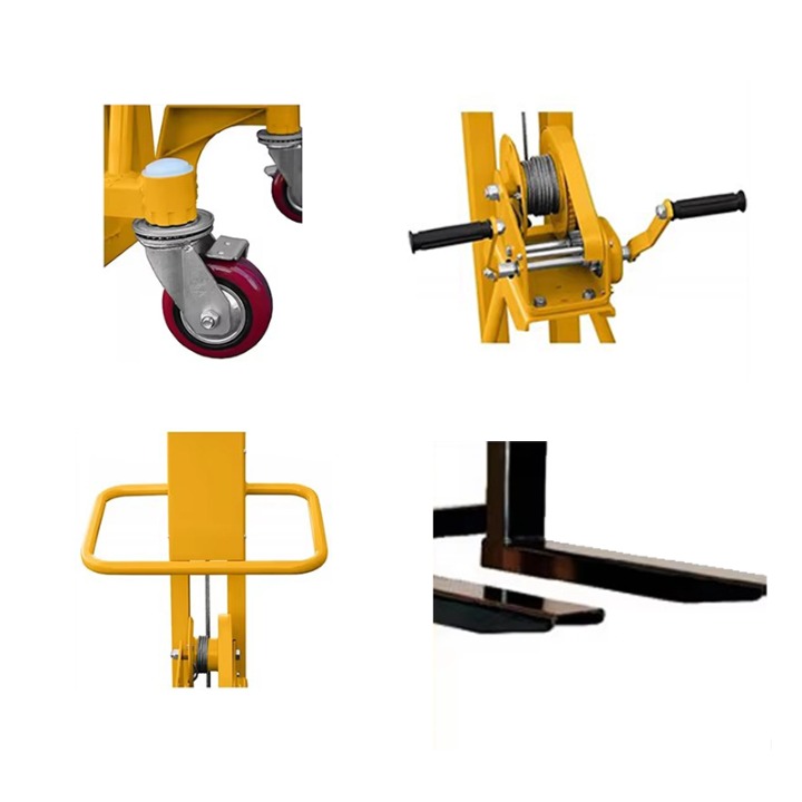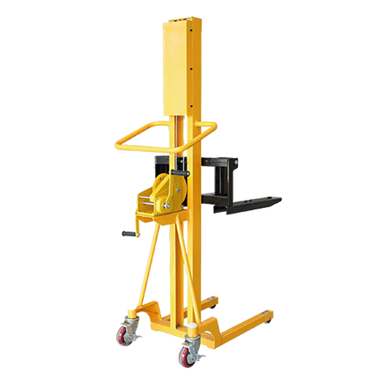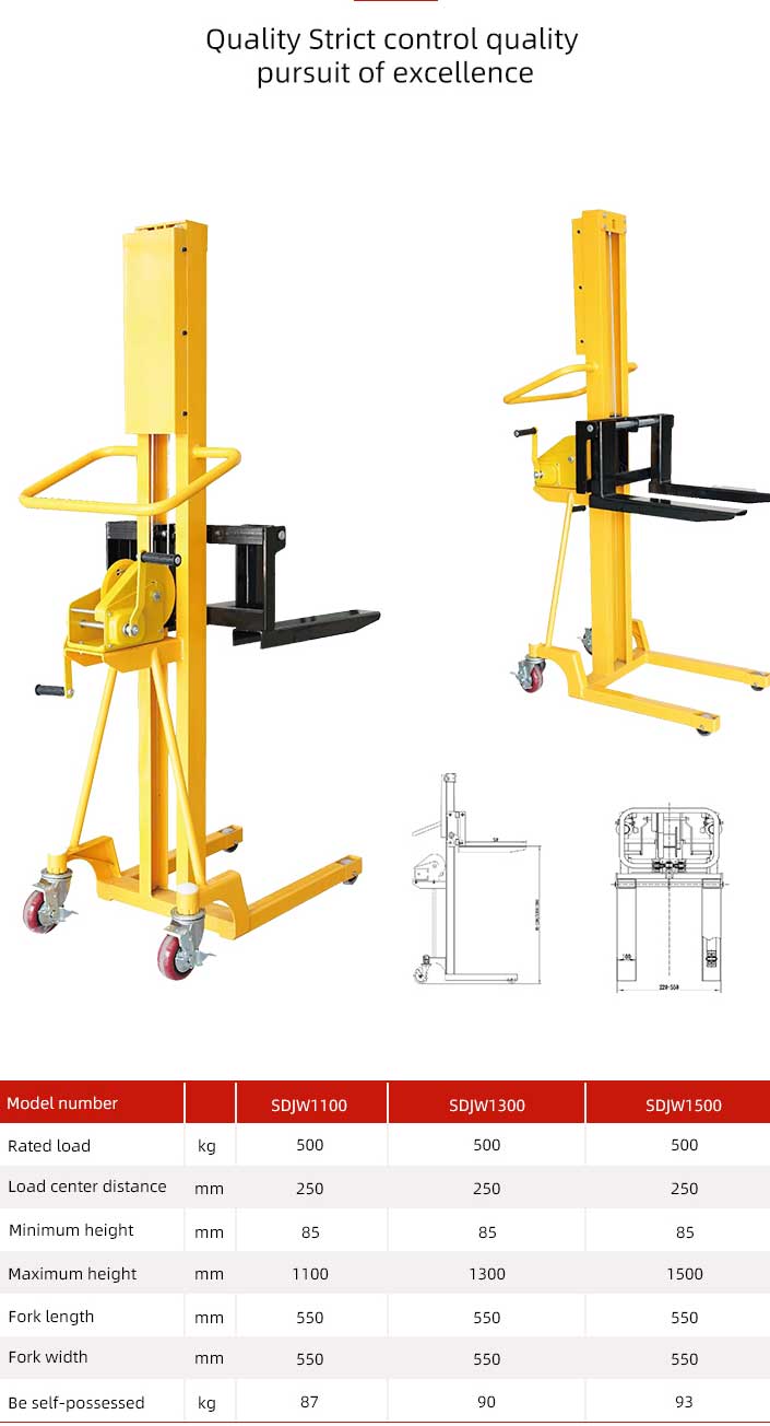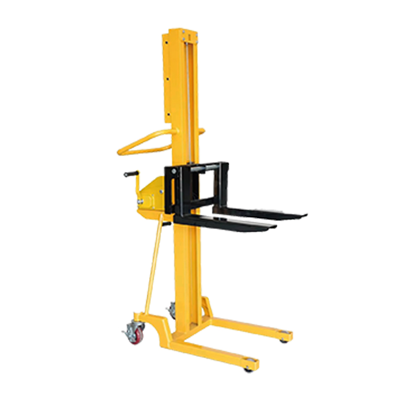 500 கிலோ ஹேண்ட் பாலேட் ஸ்டாக்கர் கை சாதனத்தை சுழற்றுவதன் மூலம், ஆபரேட்டர் உள் இயந்திர கட்டமைப்பை சரக்கு முட்கரண்டியை உயர்த்த அல்லது குறைக்க இயக்குகிறார், இதன் மூலம் ஸ்டேக்கரின் அடுக்குதல் செயல்பாட்டை அடைகிறார்.